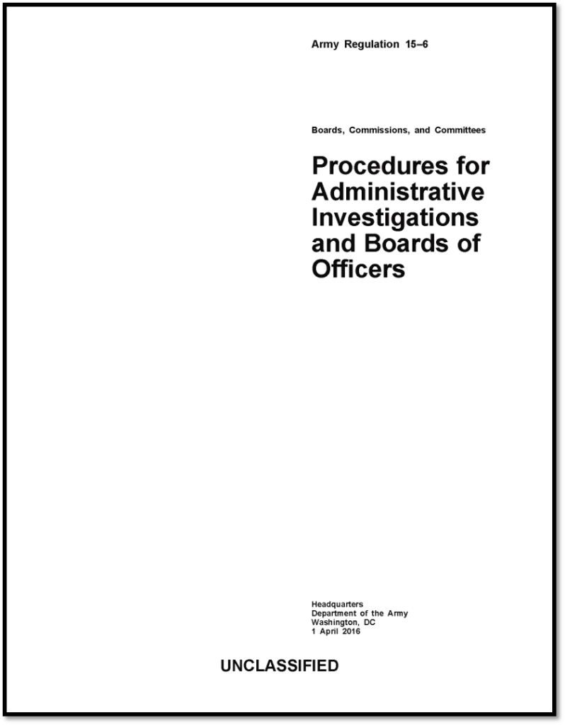 Another common investigatory tool lies in Army Regulation 15-6 (Procedures for Administrative Investigations and Boards of Officers).  This regulation covers preliminary inquiries (less formal – think R.C.M. 303 inquiries), administrative investigations (more formal), and boards of officers (most formal).  Commanders should choose the type of investigations based on the purpose of the fact-finding, the seriousness of the subject matter, the complexity of the issue, the need for documentation, and the need for a comprehensive hearing (AR 15-6, para. 1-6(c)).  For the sake of this blog post, the focus is exclusively on administrative investigations.