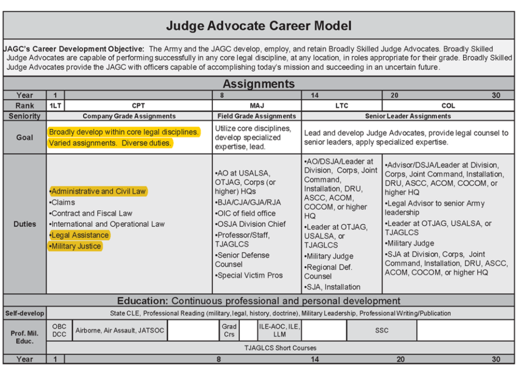 If relying solely on a detailed military legal assistance attorney, understand the advice and assistance will likely be from a junior judge advocate in his or her first assignment.  All services develop “generalists” as opposed to specialists, and assign young officers to legal assistance as their first duty.  The Army demands “diversity of assignments” for promotion.  The Navy permits judge advocates to see clients “immediately following graduation from Naval Justice School. ”  The Marine Corps strives to develop “general practitioners” not specialists.  Below is the Army Judge Advocate career model showing the effort to create generalists with “varied assignments” of captains.